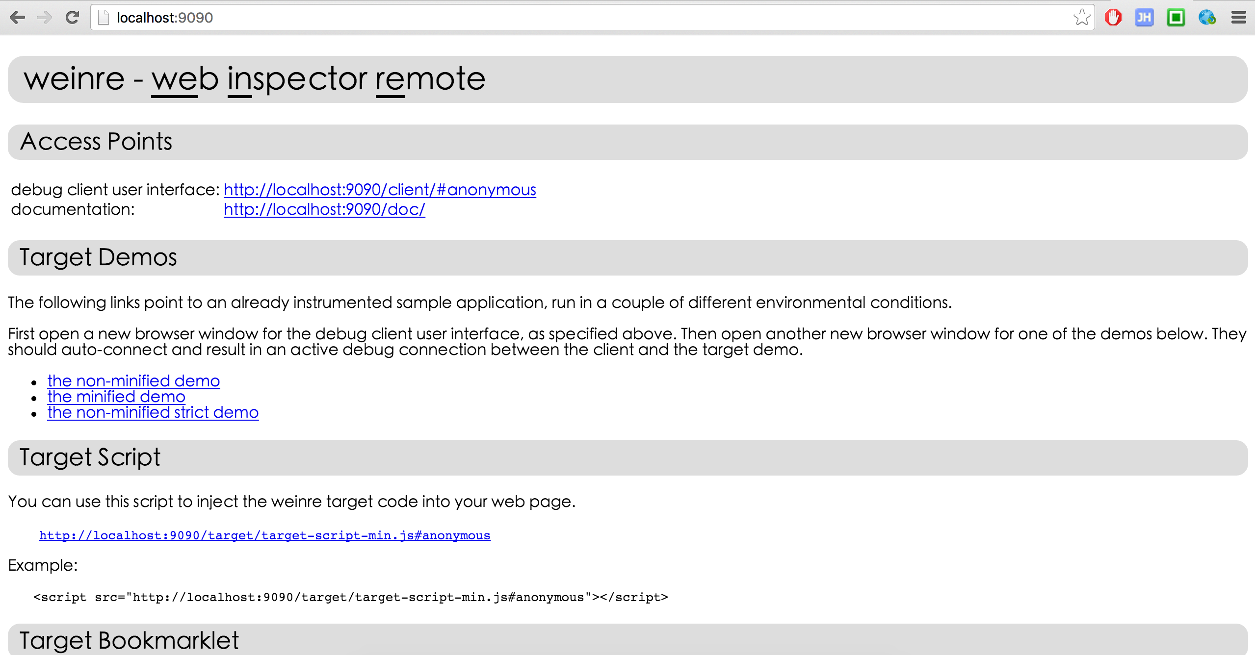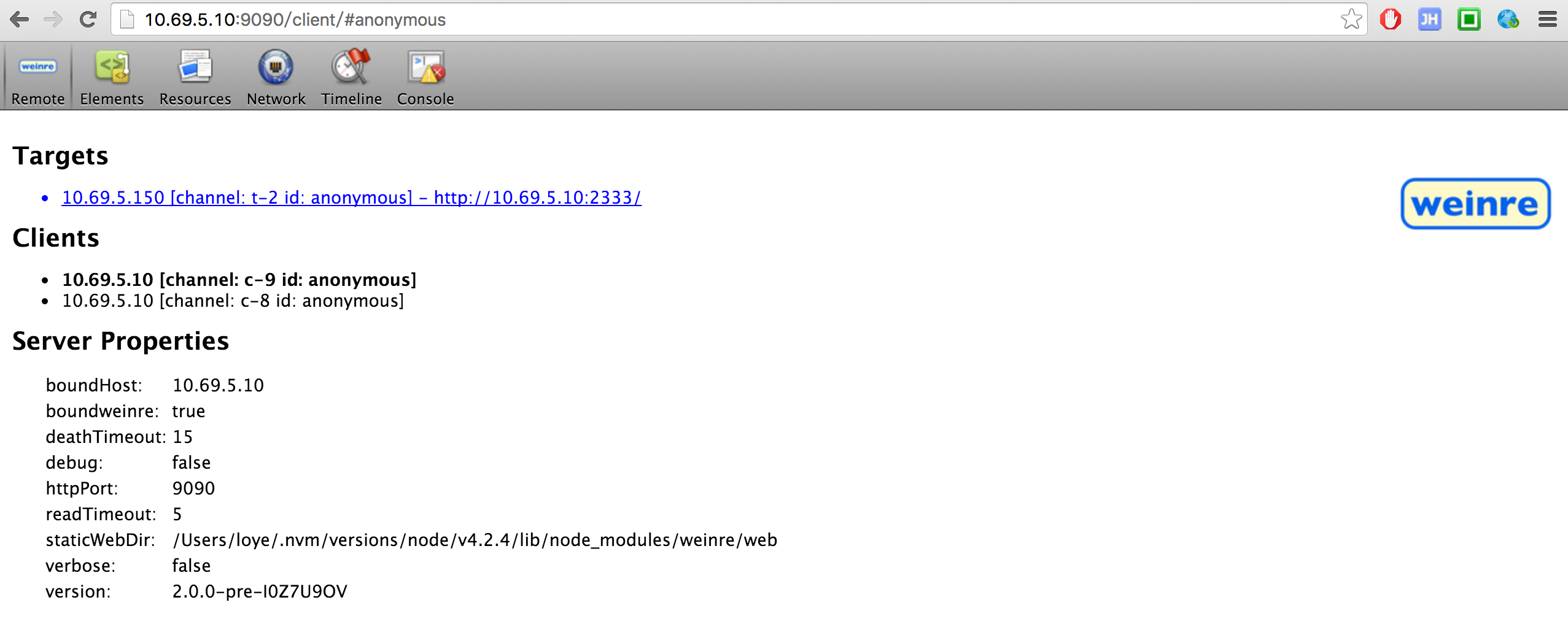 weinre --boundHost 10.69.5.10 --httpPort 9090