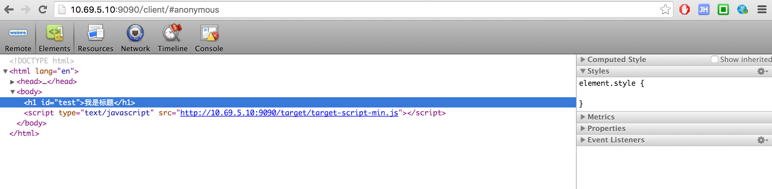 在调试页面中插入下图中 Target Script 中的js,本例即http://10.69.5.10:9090/target/target-script-min.js#anonymous。#anonymous这个是页面标志,不同的标志在选取目标调试页时可以起到识别作用。